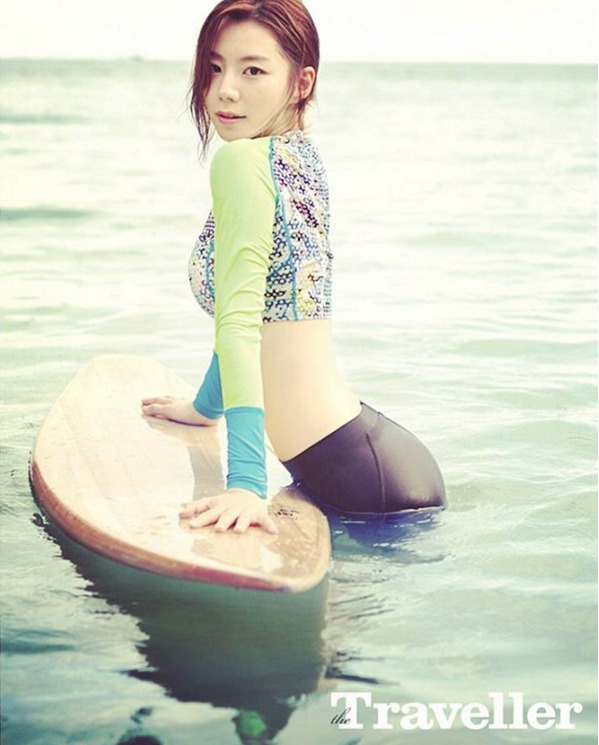 배우 박수진의 서핑룩이 눈길을 끈다.