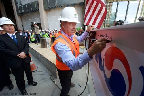 한진그룹은 8일(현지시간) 오전 LA시 다운타운에 위치한 윌셔 그랜드 호텔 프로젝트 공사 현장에서 상량식을 가졌다. 상량식은 건물을 세울 때 외부 공사를 무사히 마무리하고 내부공사에 들어가기 전에 치르는 행사로, 윌셔 그랜드 호텔 공사의 콘크리트 외관 작업을 완료한 후 호텔 옥상인 73층에 대형 크레인으로 철제 구조물을 설치했다.